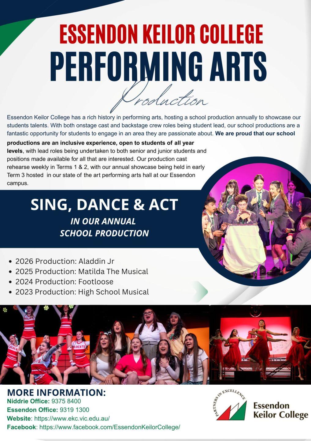 Essendon Keilor College has a long standing history of excellence in the performing arts. Our annual School Production is a highly anticipated event that welcomes students from Years 7-12.